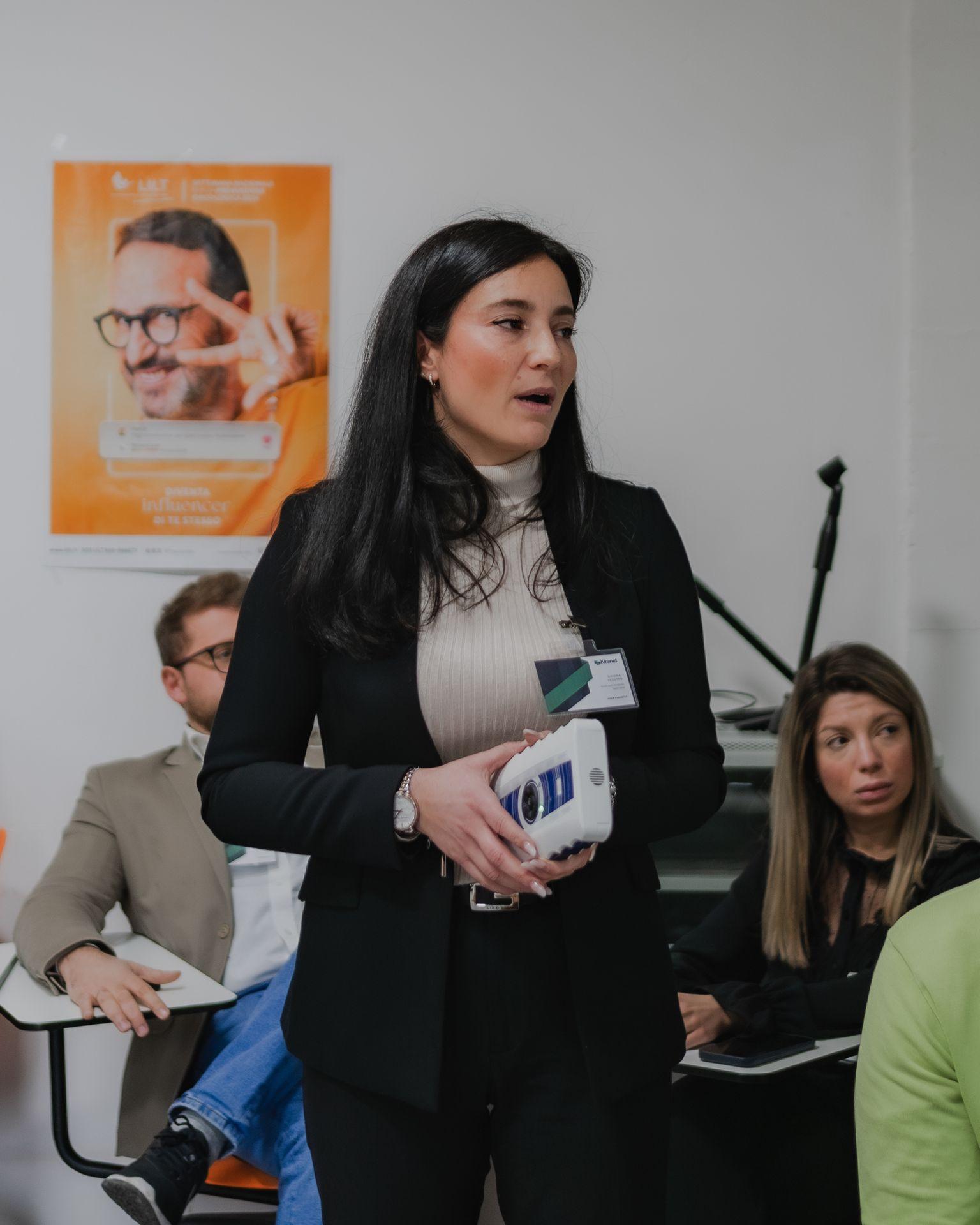 Gli input dati dall’ingegnere Chianese sono poi stati illustrati nel dettaglio dagli ingegneri Simona Velotto e Gennaro Verde (dell’azienda COEVIA SISTEMI, spin-off di KIRANET, che realizza i prodotti elettromedicali), oltre che da Raffaele Lucca, sviluppatore di software embedded. I professionisti hanno presentato il progetto FIDRAY, il dispenser automatico portatile per la gestione delle terapie farmacologiche domiciliari. Questo prodotto elettromedicale riduce il rischio clinico legato all’errore durante l’assunzione dei medicinali in autonomia da parte dei pazienti.