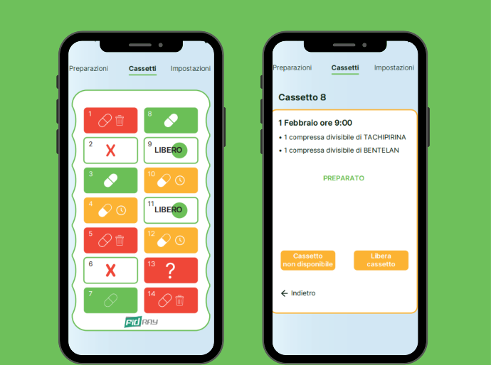 Con HOMECARE FARMACO-TERAPIA ogni paziente viene dotato di FIDRAY, il dispenser automatico portatile che supporta la preparazione e la successiva auto-somministrazione dei farmaci prescritti.