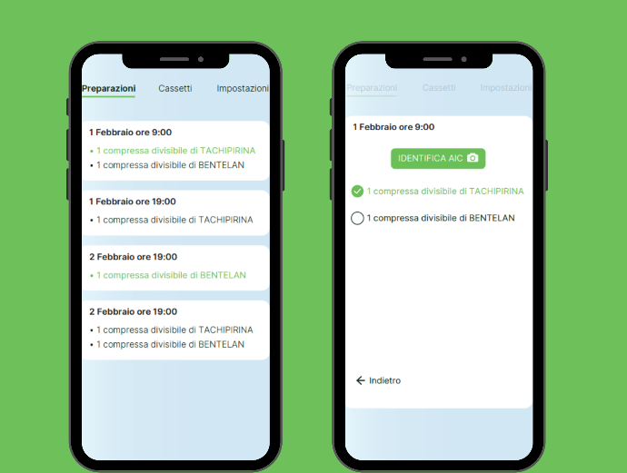 FARMACO-TERAPIA consente la corretta somministrazione dei farmaci in autonomia, sia a casa che fuori, garantisce il monitoraggio continuo dei processi clinici, con la tracciatura di tutte le operazioni eseguite dal paziente