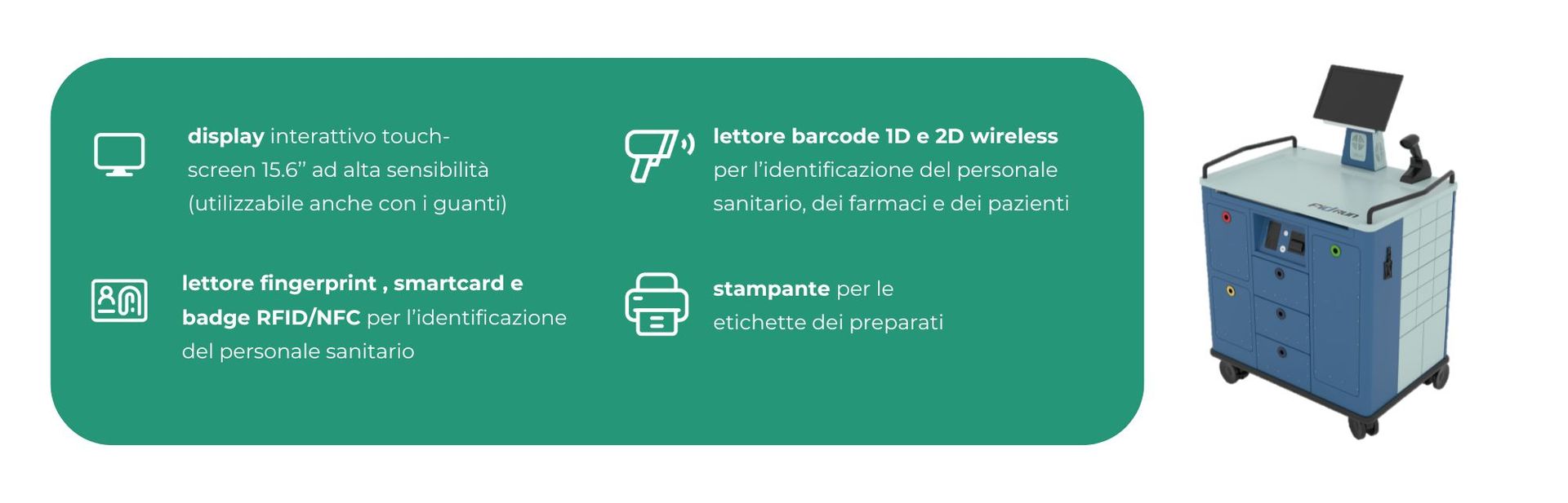FIDRUN è il carrello automatizzato che riduce il rischio clinico legato all’errata associazione “paziente-terapia” e migliora la gestione del magazzino dei farmaci.